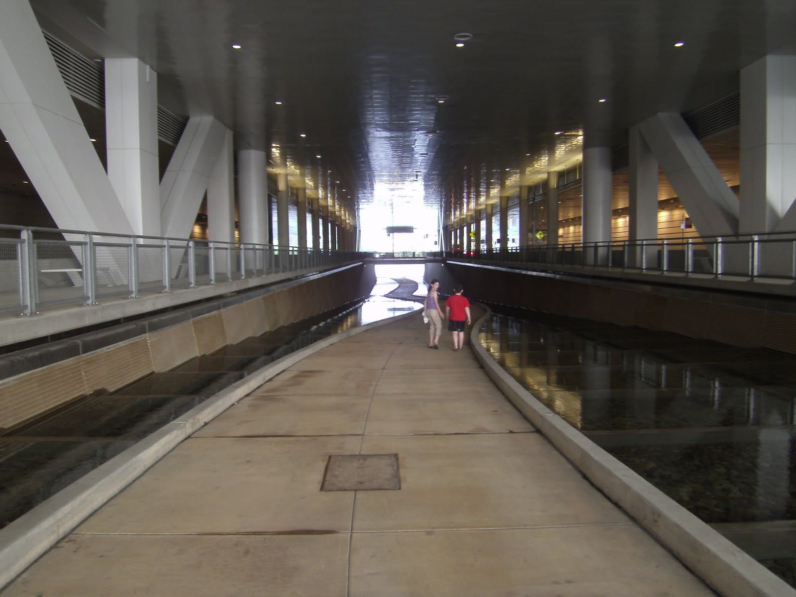 There's a really neato water feature that runs underneath the Convention Center. You can walk down the concrete ramp/pathway there and go under the sidewalk, and come out on the riverfront.